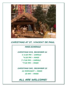 St. Vincent de Paul Parish is a faith community striving to live Jesus’ gospel message of love, peace, and justice for all peoples. In the spirit of St. Vincent de Paul, we will serve those in need in our world through our ministries.