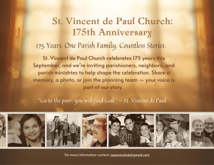 St. Vincent de Paul Parish is a faith community striving to live Jesus’ gospel message of love, peace, and justice for all peoples. In the spirit of St. Vincent de Paul, we will serve those in need in our world through our ministries.